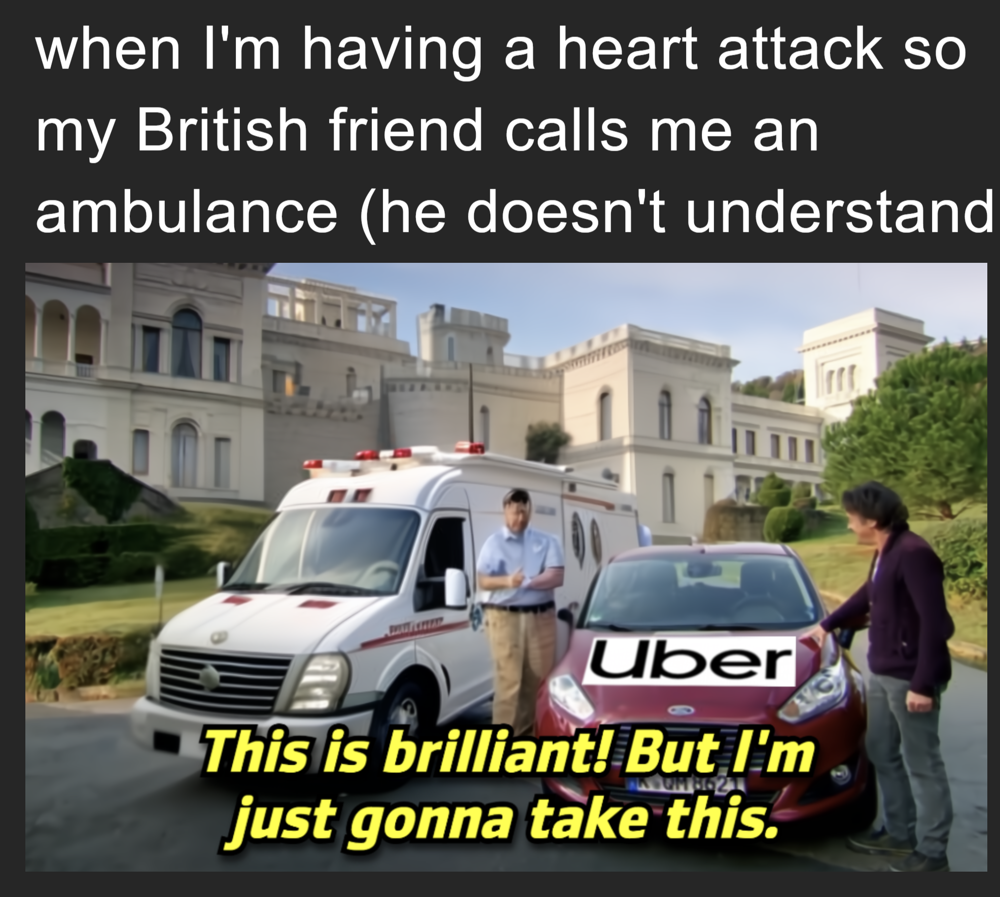 With the level of ambulance delays after 14 years of managed decline under the Tories, you might be better off with the Uber in the UK too. Just for different reasons.