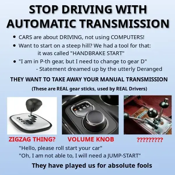 Try sitting in traffic for 2 hours with a stick, moving 10 feet at a time, and we can talk about how much you love manual