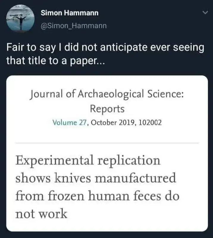 “There is a well known account of an old Inuit man who refused to move into a settlement. Over the objections of his family, he made plans to stay on the ice. To stop him, they took away all of his tools. So in the midst of a winter gale, he stepped out of their igloo, defecated, and honed the feces into a frozen blade, which he sharpened with a spray of saliva. With the knife he killed a dog. Using its rib cage as a sled and its hide to harness another dog, he disappeared into the darkness.”There’s also the story of Danish explorer Peter Freuchen, who claims to have used his own frozen shit to make a chisel to dig himself out of some ice. The paper takes the time to say that it is strictly about knives, though, not chisels