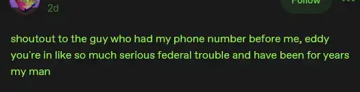 I dunno, but there’s a guy in prison somewhere in Georgia who’d been trying to make collect calls to talk to them for months. I never got to learn more because the calls always came in super early in the morning when my phone was on silent, so it was always just voicemails.