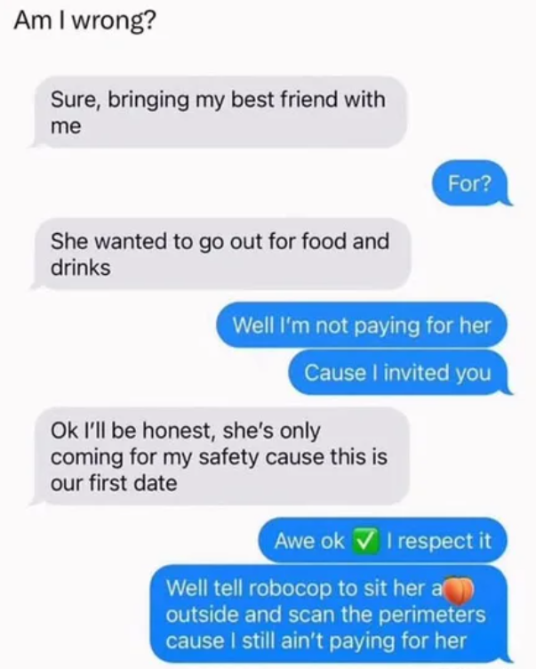 Well yeah, but bringing an extra for a dinner date is weird. I’ve brought extra people along to meet the person I’ll be eating with and confirm my location. Having an extra person suddenly in the date dynamic kills the dynamic.