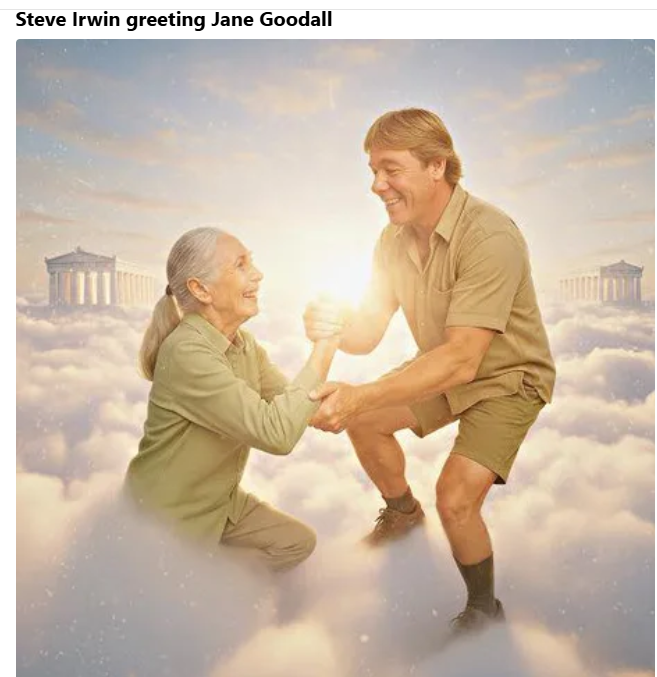 Jane Goodall dies, sees the Greek buildings, and realizes she should’ve prayed to Zeus.