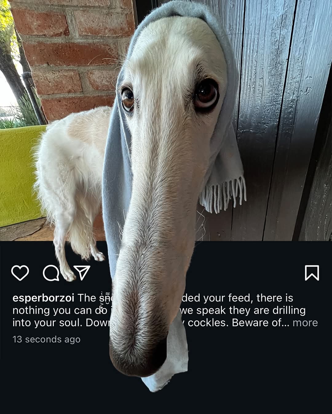 Borzois are so funny to me, because people purposefully made them look like this. I mean, I’m glad that they did, but were any of the breeders ever satisfied with what they wrought? Did they ever decide that the nosemaxxing grindset had gone too far?