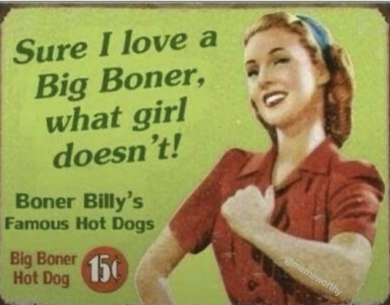 I was going to say ‘lesbians’ but…this ad is also for a hot dog by the same name, so lesbians might actually love a big boner too, they just won’t know unless they try one, right? Be sure to tell all your lesbian friends that. They might “relish” a big boner in their mouth, afterall.