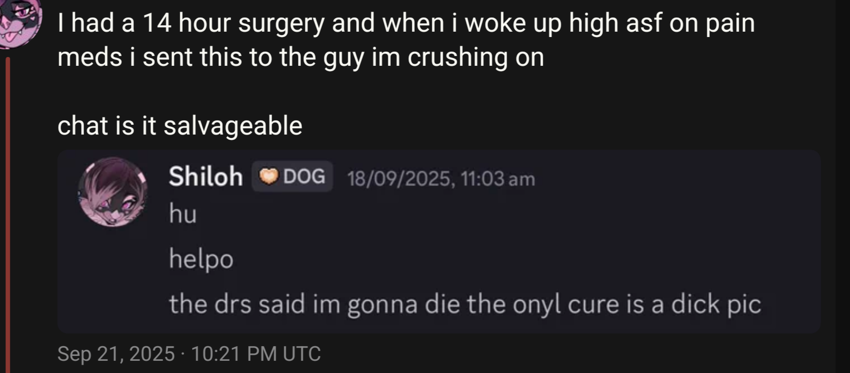 minus-squarehedgehogging_the_bed@lemmy.worldlinkfedilinkarrow-up138·23 days agoThe very rare -solicited- dick pic. Dude should be flattered.