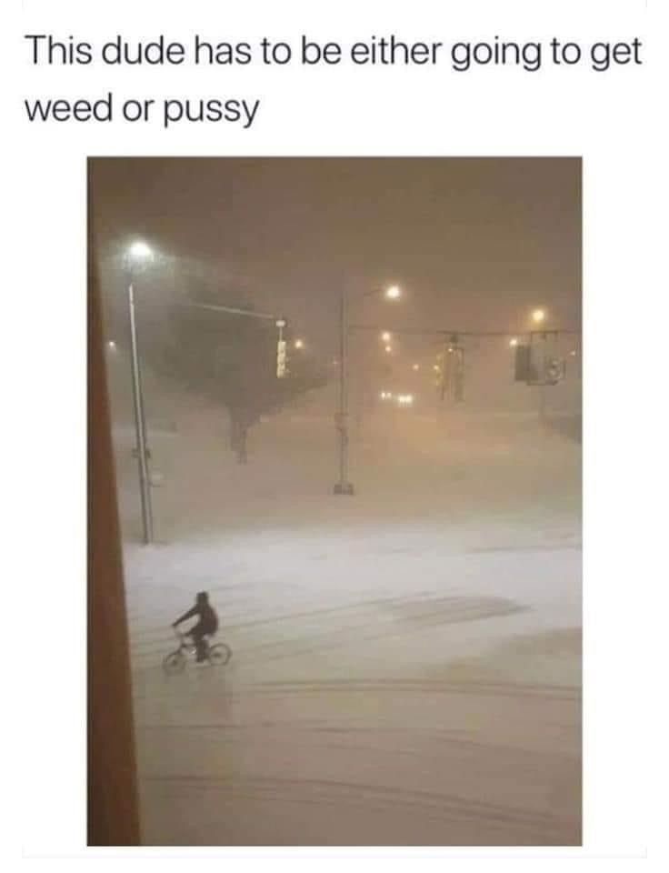 A picture of a guy on a bicycle taken from a window. The roads are covered in snow and the weather looks cold and miserable. Caption reads “This dude has to be either going to get weed or pussy.”