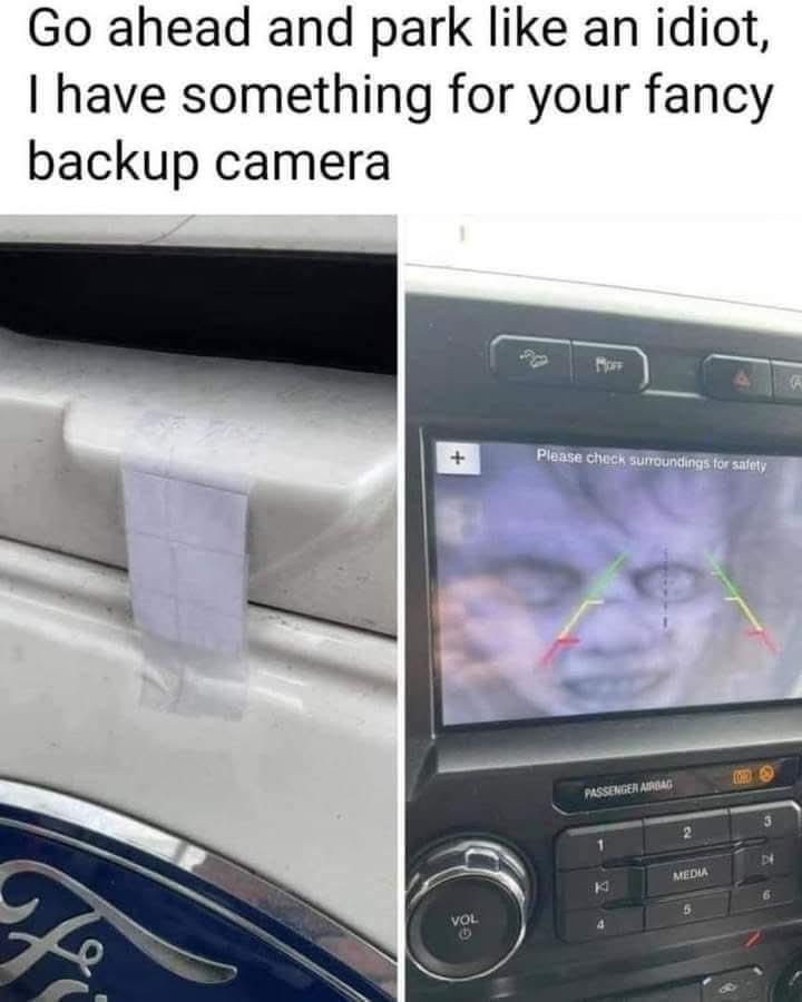 “oh look, that car has a novelty sticker for my backup camera on it, that’s fun.” Continues on the day