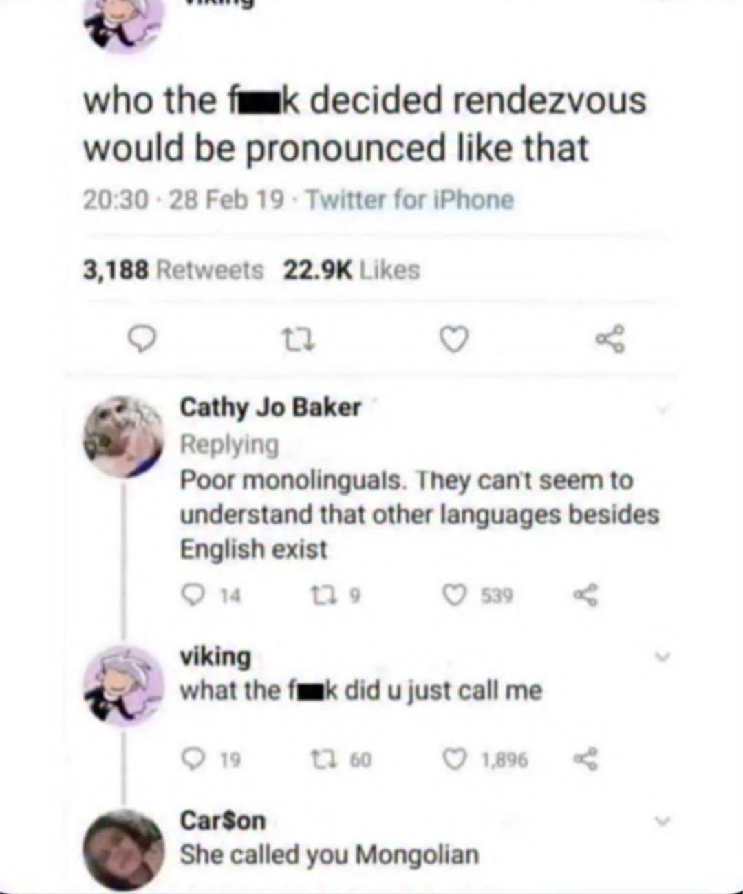 minus-squareX@piefed.worldlinkfedilinkEnglisharrow-up23arrow-down1·7 days agoPretty sure it was the Swedish who decided the pronunciation of “rendezvous”. Kinda obvious, really.