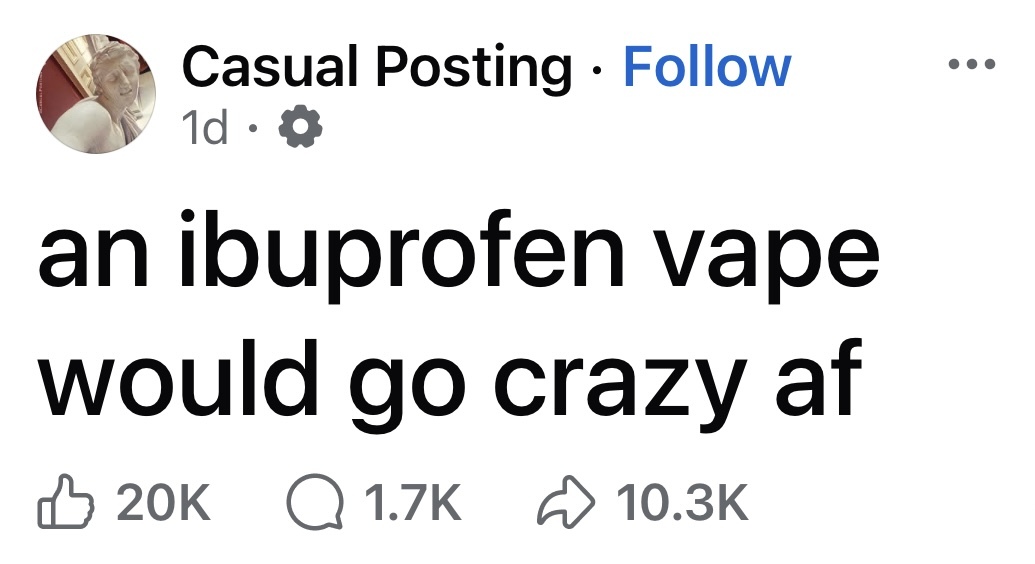 minus-squaredditty@lemmy.dbzer0.comlinkfedilinkarrow-up21arrow-down1·26 days agoI SAID AN IBUPROFEN VAPE WOULD GO CRAZY AF