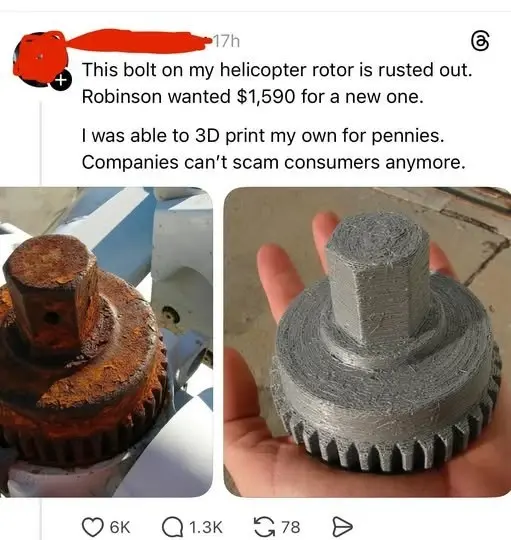 This is such a perfect example of why right-to-repair matters: sometimes a “$1,590 part” is really just access. Also, that print looks solid — I’d still check material/heat/vibration limits on a rotor part, but the ingenuity is 💯