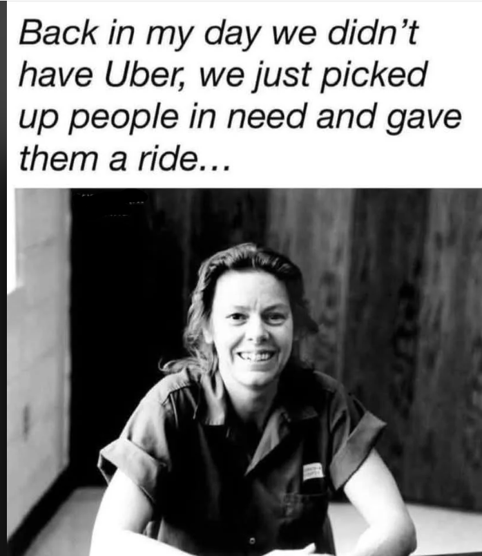 Pretty sure that Aileen Wuornos, she was a American female serial killer who in 1989-1990 killed over ½ a dozen men; sometimes in their cars after hitch hiking or engaging in prostitution