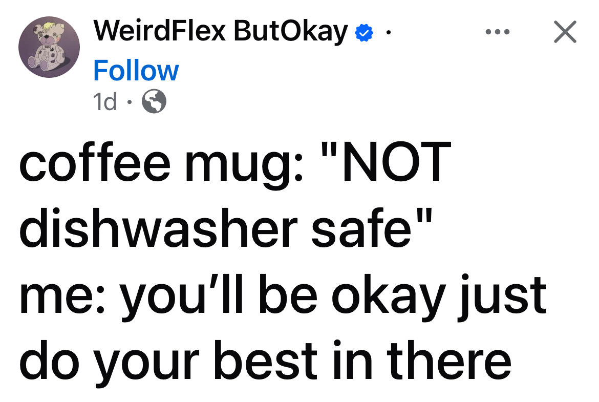 TBF I scoffed at this for years. Then I put a collectible mug that wasn’t made anymore in there and bye bye handle. Sadface. It’s stupid that we can’t make coffee mugs that can handle this. What is this, the 19th century?