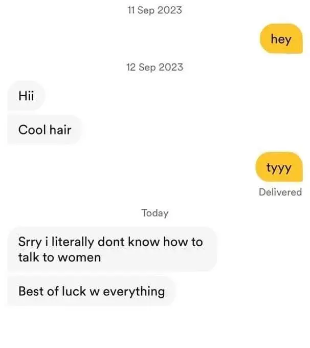 minus-squareGreenBeanMachine@lemmy.worldlinkfedilinkarrow-up89·edit-215 days agoShe clearly doesn’t know how to talk to men either. If all you text is “hey” to a woman as a first message, you can be sure 99.9% percent of them won’t even respond. At least he tried and gave her a compliment.