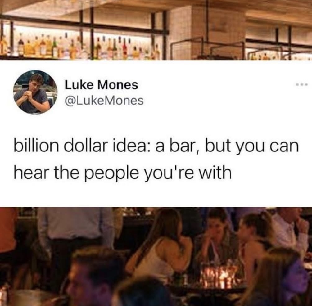 These ‘factory look’ restaurants ,with high ceilings with all the pipes and ducts exposed, can fuck right off. Then they pump in music so everyone has to shout, adding to the ‘ambiance’. That shit is the laugh track of social interaction.