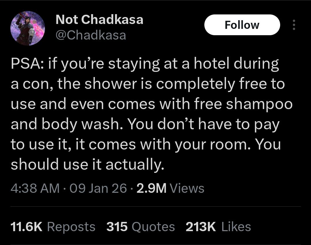 I shower twice a year whether I need it or not and it’s not my problem if that schedule coincides with the furcon thank you very much.