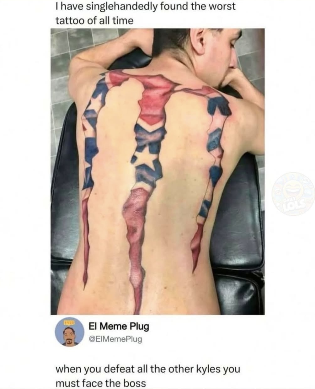 minus-squareTartas1995@discuss.tchncs.delinkfedilinkarrow-up8·3 months agoAnd back skin that ripped open… Ripped open back skin and that flag reminds me of something.