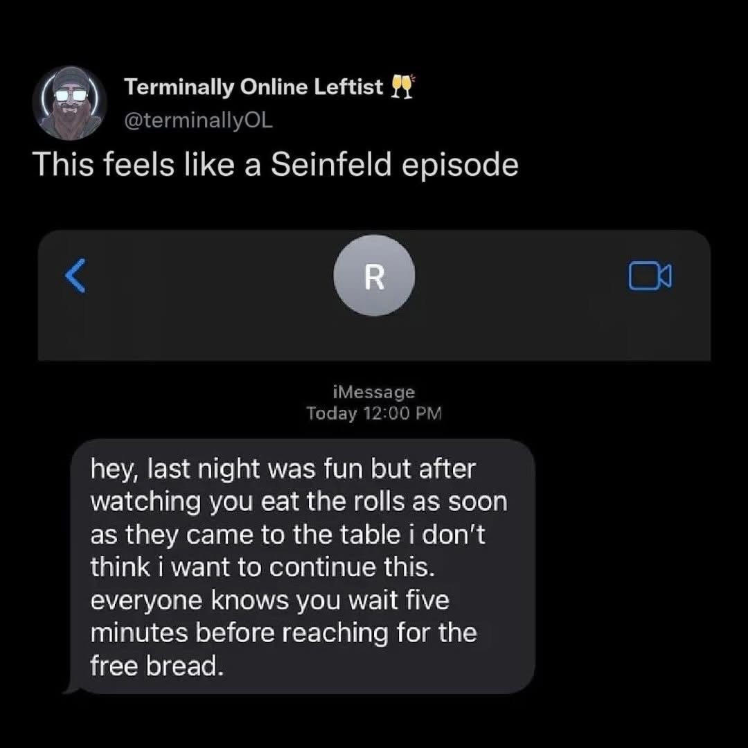 minus-squareBillyClark@piefed.sociallinkfedilinkEnglisharrow-up34arrow-down2·9 days ago“After seeing you enjoy good food as it was intended, I don’t think I want to continue this. Everyone knows food must only be eaten after you upload pictures of it to Instagram and get a certain number of interactions.”
