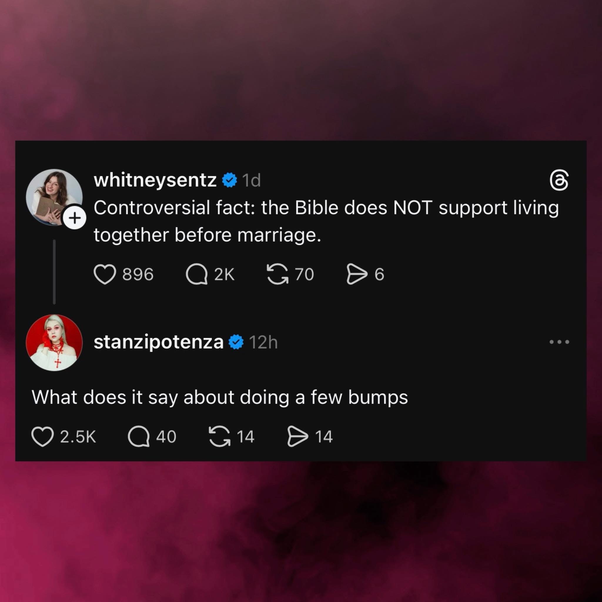 And I see Stanzi is on her Madonna-styled Trinitarian rebellion, lol. I love her content, hopefully she’s not doing too many bumps!