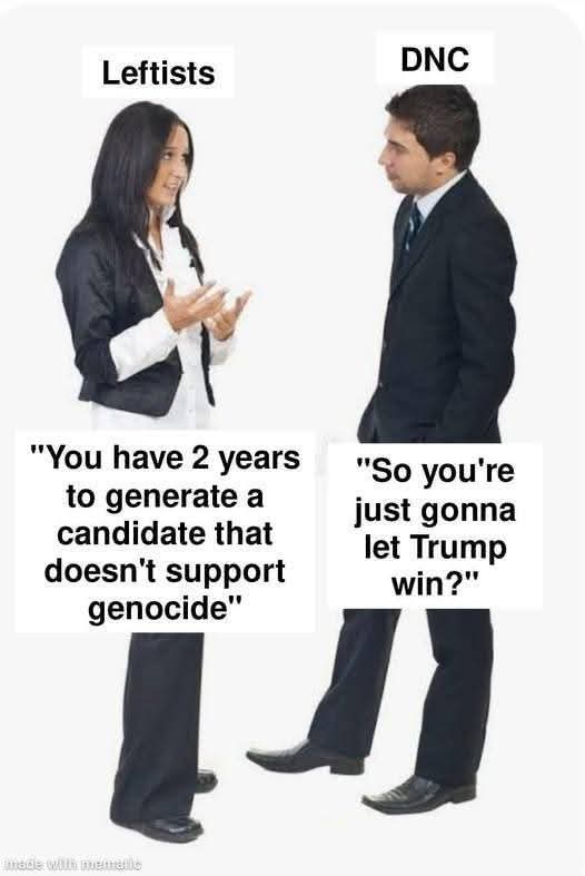 Now I’m not saying the DNC isn’t wrong, they’re fucking morons. But you guys just gave up on global warming, gay rights, trans rights, Gaza, any sembles of the environment, public health, the entire “justice” system, the courts, your immigrant neighbours, all people of colour in the US, and women’s rights.