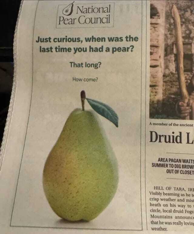 minus-squarehperrin@lemmy.calinkfedilinkEnglisharrow-up13·7 days agoPlease, bro! Pears are so good! Don’t you remember how it tasted? No? Maybe if you try harder? Still no? Ok, well trust us, it’s definitely memorable.