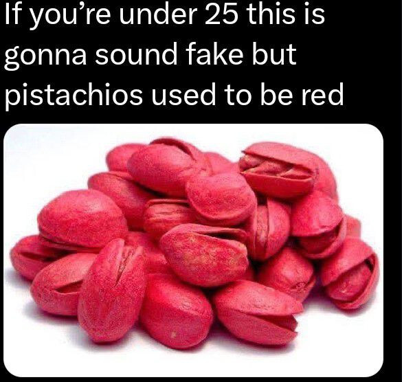I also figured this was just a “let’s screw with the youth”-type post. We used to eat pistachios all the time when I was a kid (I’m 35) and I don’t think I’ve ever seen a red one before today. They were always beige/greenish.