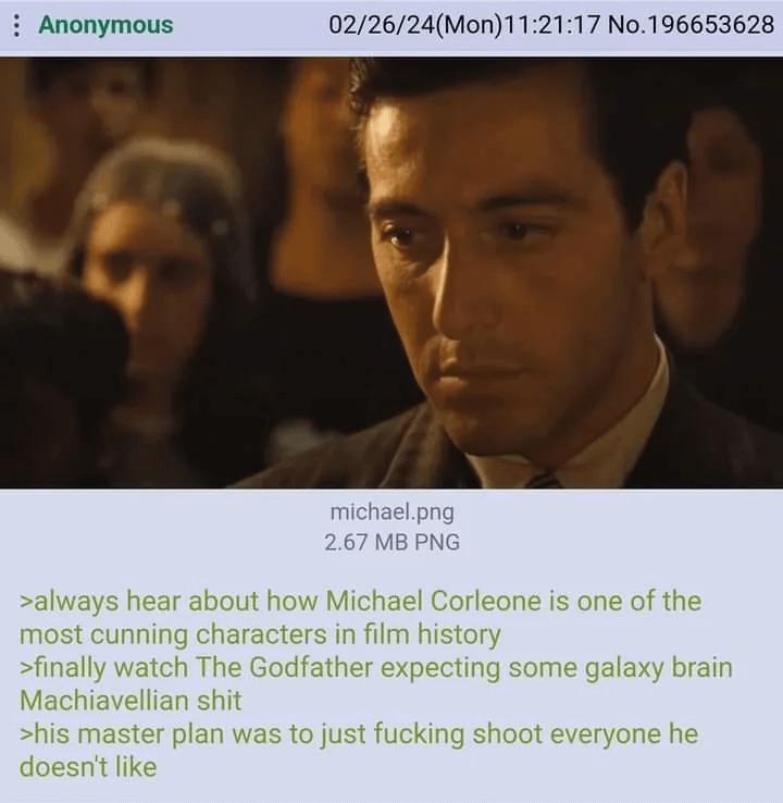 Everyone said the third one was shit. But it was the pentultimant consequence of Michael’s success. He was all alone at the end, a victim of his own ruthlessness and success. It completed the arc.