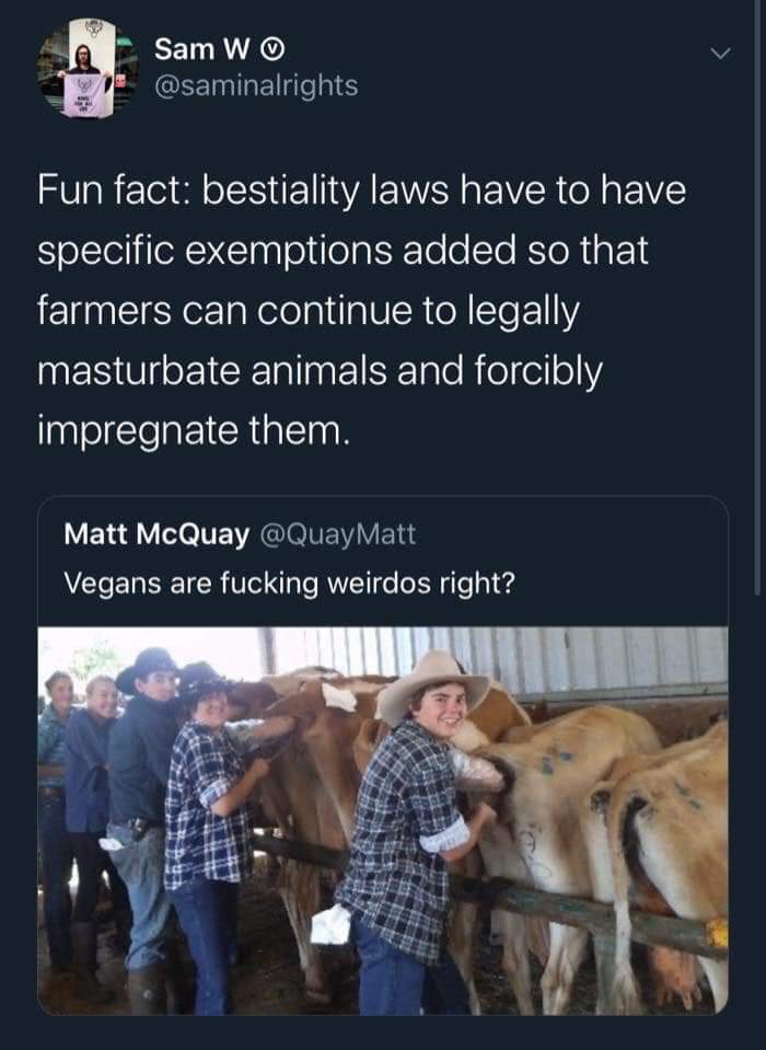Cows cannot give consent to humans. No animal can. Hell, even if we discovered another human-like species but couldn’t have meaningful communication with them, it’d still be rape.