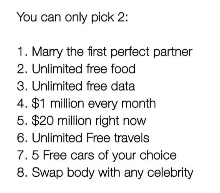 #5 to invest immediately and #4 to afford 2-3 and 6-7 over time, without noticing the draw on my account. With decent yeilds on investments, I’ll be getting lots of things for “free”. Swapping bodies with a celebrity is creepy, no thanks. Marriage? Never again.