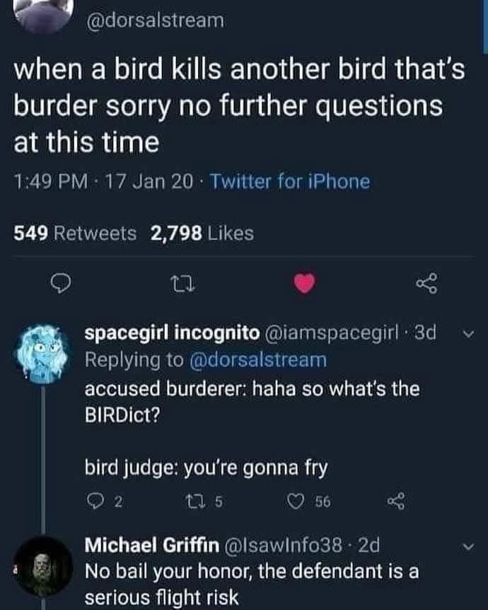 MTZ@lemmy.world to Lemmy Shitpost@lemmy.world · 1 month agoBird Lawlemmy.worldimagemessage-square15linkfedilinkarrow-up1530arrow-down13
