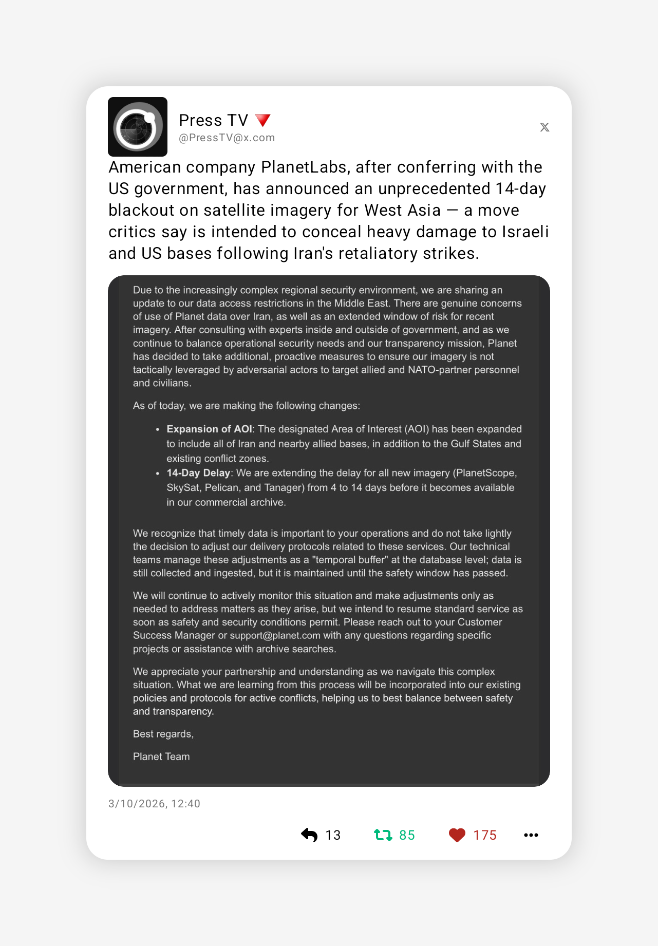 arrow-up133arrow-down1imagePlanetLabs, after conferring with the US government, has announced an unprecedented 14-day blackout on satellite imagery for West Asialemmy.mlA🔻atar of 🔻engeance@lemmy.ml to Twitter@lemmy.mlEnglish · 16 days agomessage-square9linkfedilinkfile-text