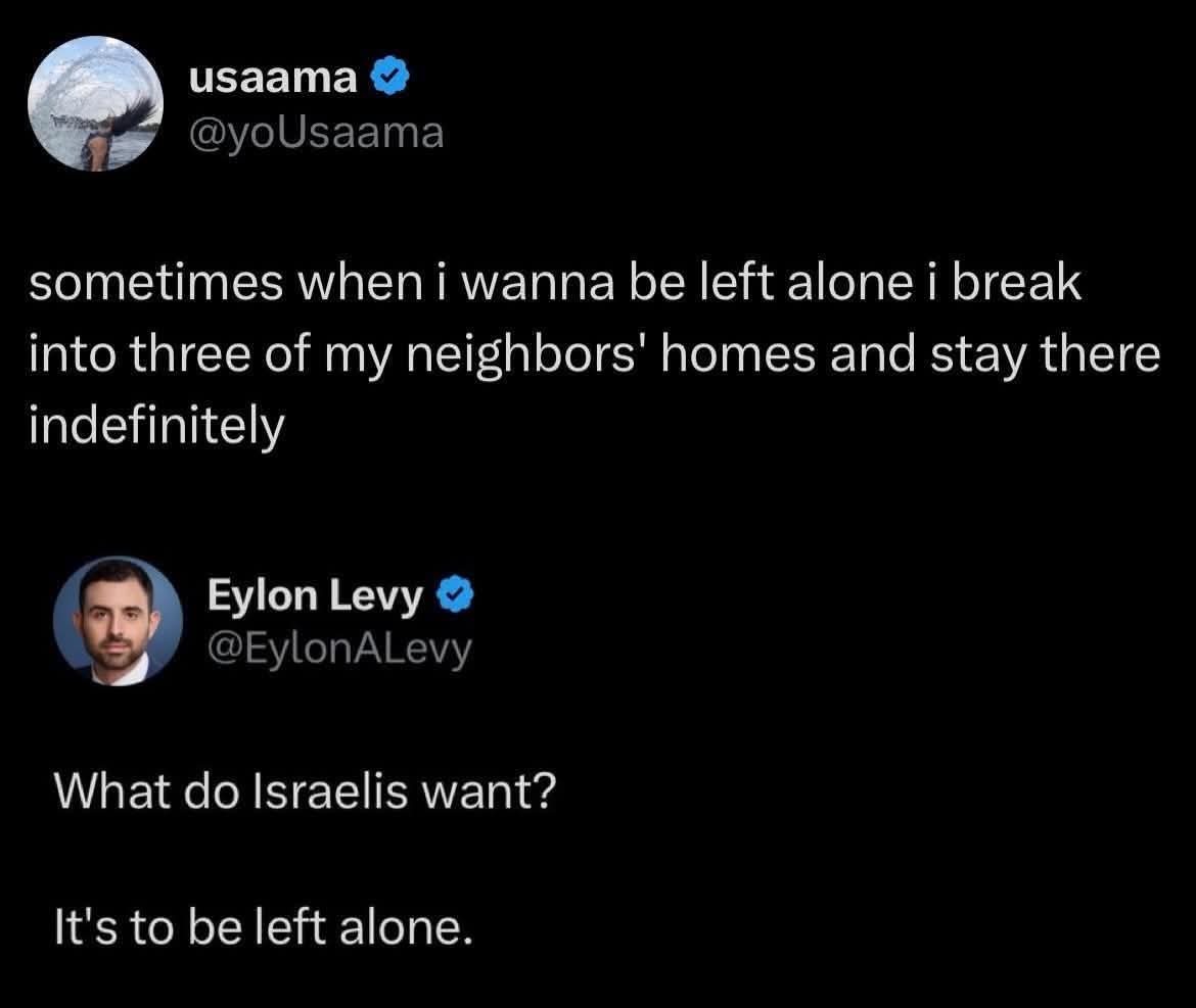 Historical wrongs don’t let you invade your neighbours. And given that Israel was founded as a way to export people from their existing homes, maybe it shouldn’t exist. Maybe the forces that formed Israel should repatriate their citizens and stop this leibensraum shit they’ve picked up from their past abusers.