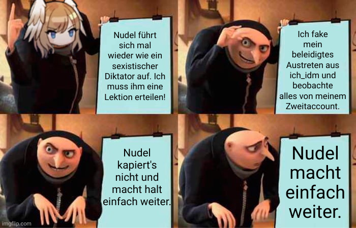 ich schreib schon eifrig in die nudel-chronik, dass wegen euniels Neid auf deine Sexdiktatorposition eine große rivalität zwischen euch entbrannt ist, die in den Bus-Nudelschen MichMich-Krieg gipfelte.