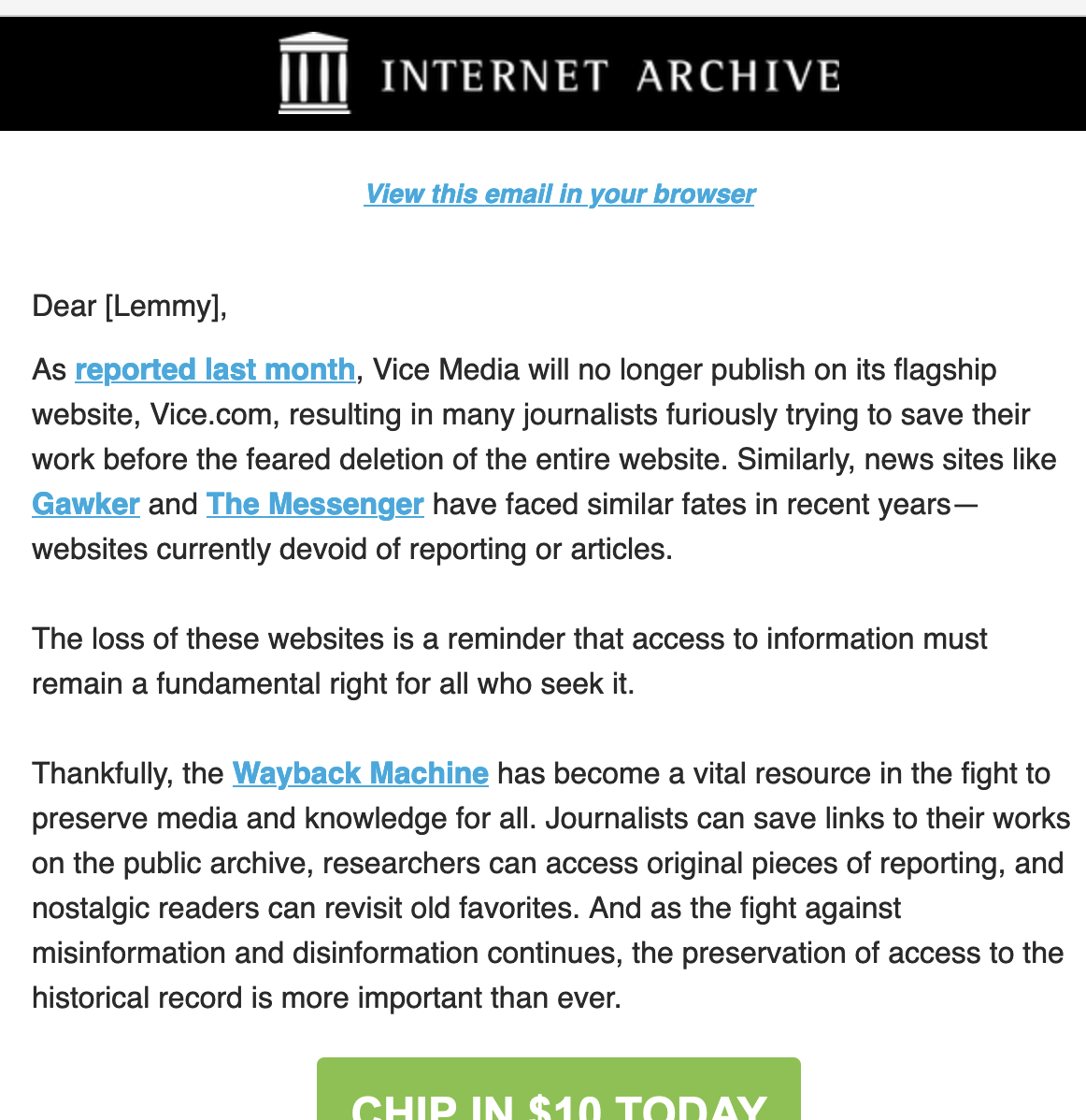 PS: I would link the email, but it has my name in it. Also, if you’re a millionaire the Archive would probably appreciate like half of it, and more normal people can do five bucks a month (but I get it you might be broke!). Donation link