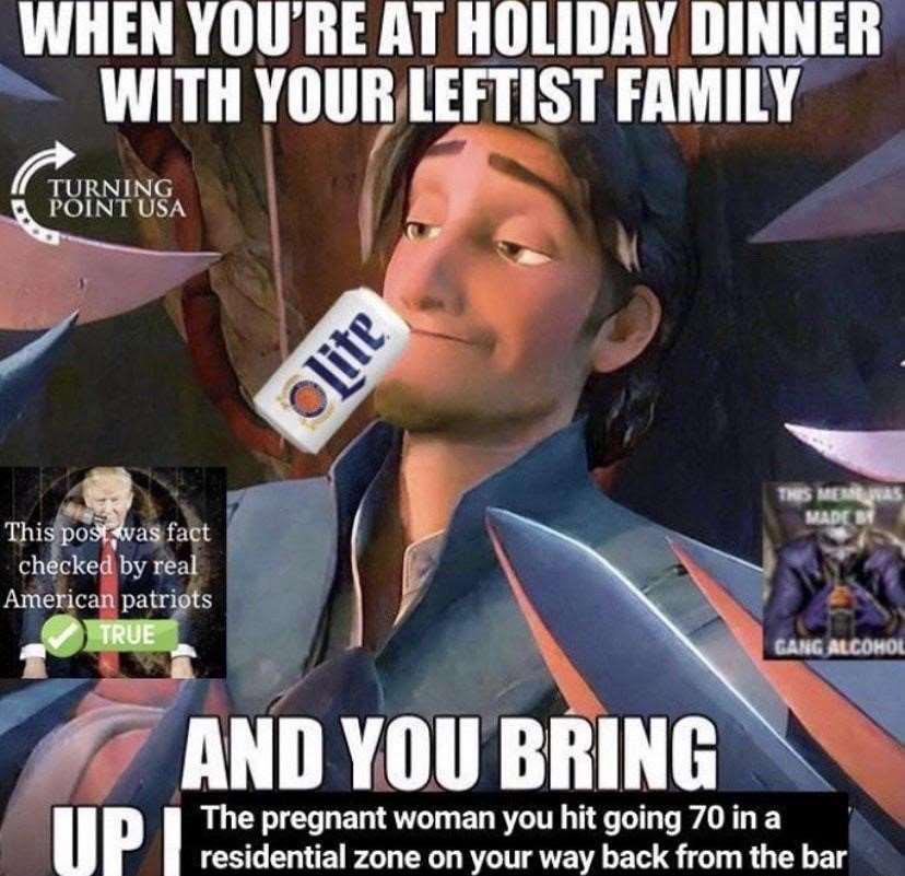 Reference to when you’re at holiday dinner with your leftist family and you being uo the pregnant woman you hit going 70 in a residential zone on your way back from the bar.