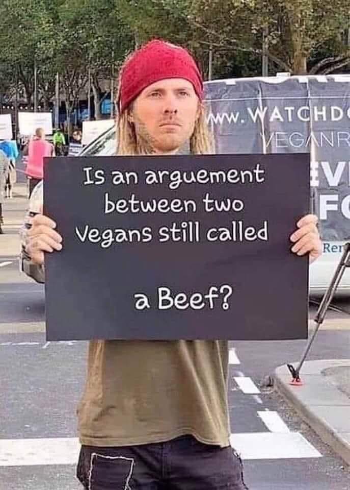 RegularJoe@lemmy.worldOPto Lemmy Shitpost@lemmy.world•Beyond Beef? Impossible Beef? I Can't Believe It's Not Beef?1·2 months agoA man with a sign that reads, “Is an argument between two vegans still called a beef?”