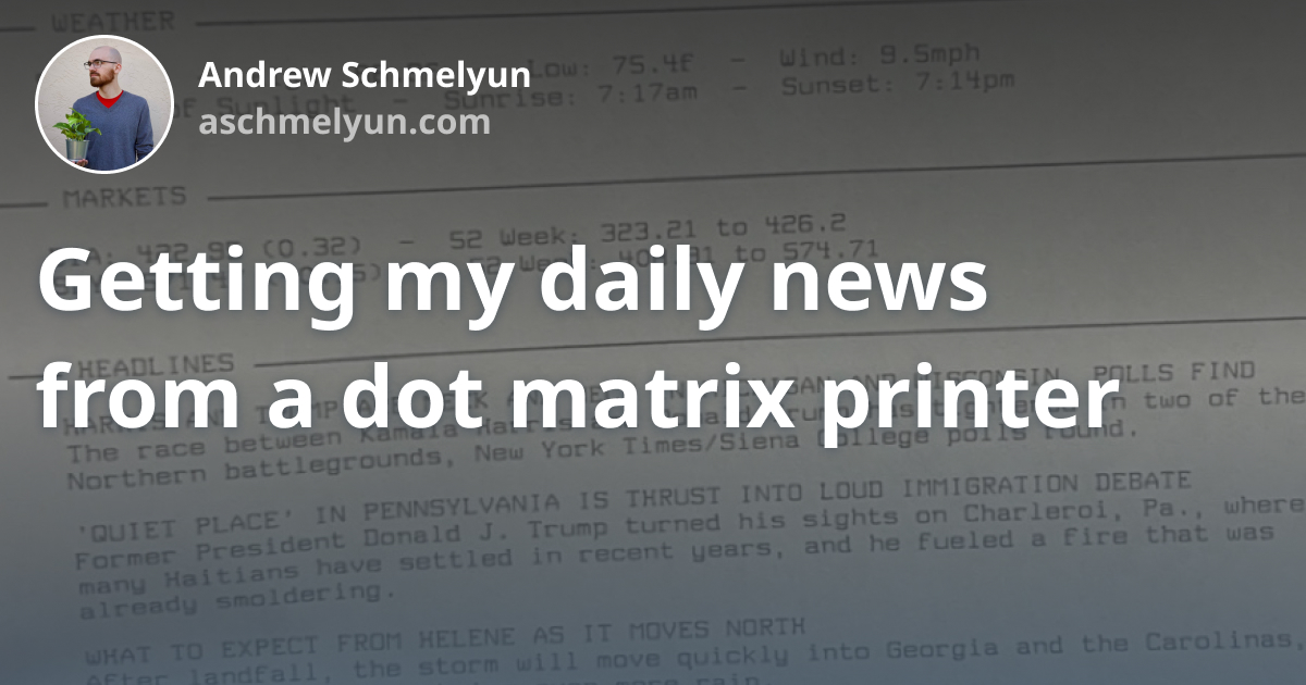 captainkangaroo@discuss.tchncs.de to Technology@lemmy.worldEnglish · 1 year agoGetting my daily news from a dot matrix printerplus-squareaschmelyun.comexternal-linkmessage-square23linkfedilinkarrow-up183arrow-down18